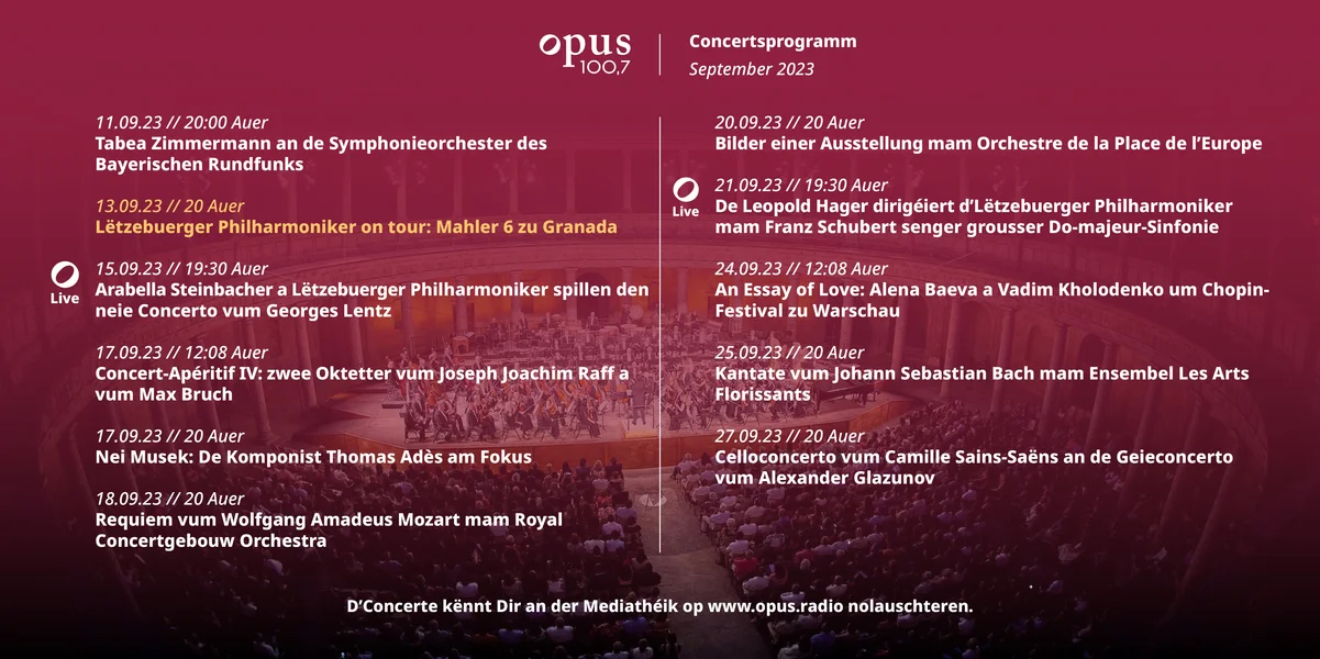 D’Lëtzebuerger Philharmoniker verzauberen net nëmmen am Grand-Duché hire Publikum, mee kënnen och reegelméisseg am Ausland begeeschteren. Ufank Juli stounge si ënner der Direktioun vun hirem Chefdirigent Gustavo Grimeno op der Open-Air-Bün vum Palacio de Carlos V zu Granada. Lauschtert d’Live-Opnam mam Gustav Mahler senger 6. Sinfonie e Mëttwoch, 13. September um 20 Auer um opus 100,7.