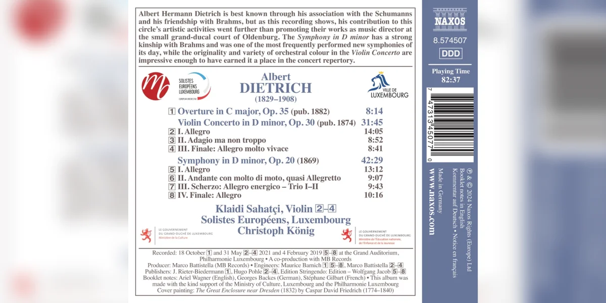 De Christoph König an d'Solistes Européens, Luxembourg hunn e ganzen Disk der Musek vum Albert Dietrich dediéiert. Drop ze héiere sinn d'Ouverture Op.35, de Geieconcerto Op.30 an d'Sinfonie Op.20. De Christophe Mirkes huet beim Dirigent Christoph König nogefrot, wat fir hien d'Musek vum Albrecht Dietrich ausmécht a wéi d'Solistes Européens, Luxembourg an insgesamt nëmmen 3 eenzelnen Deeg dee kompletten Disk konnten ophuelen.