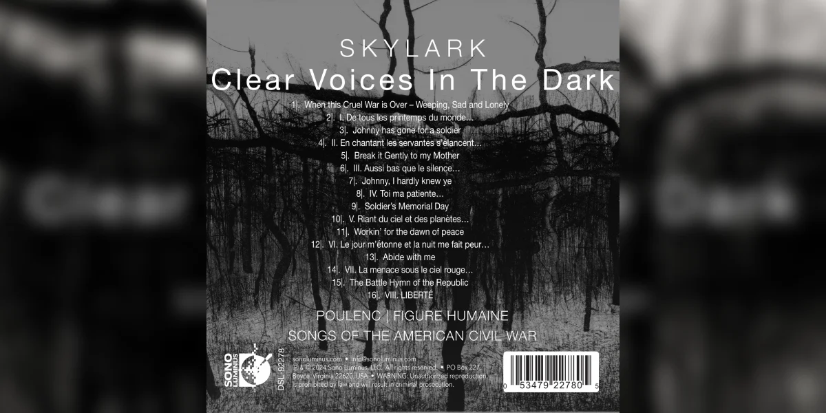 ‘Clear Voices in the Dark’ heescht den neien Album vun deem amerikanesche Kammerchouer Skylark. Den Ensembel erënnert programmatesch un zwee tragesch Kricher: engersäits den amerikanesche Biergerkrich, anerersäits den Zweete Weltkrich. Musikalesch dréckt sech dat a Lidder aus dem Biergerkrich an dem Zyklus ‘Figure Humaine’ vum Francis Poulenc aus. Grad an dësen Zäiten ass den Album thematesch leider héichaktuell. Musikalesch huet en seng Stäerkt virum allem an den Interpretatioune vu Skylark, deen et fäerdegbréngt, zwee ganz verschidde Genrée beieneen ze bréngen.